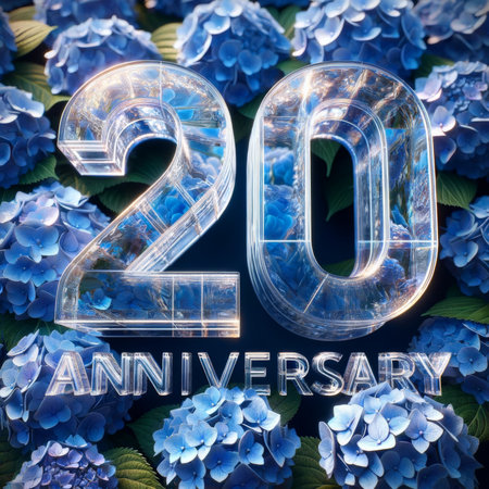Number 20 encased in crystal, surrounded by blue hydrangeas, symbolizing two decades of memories and clarity.