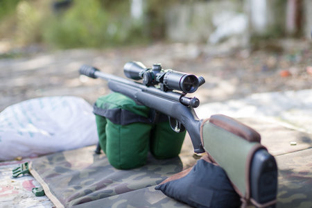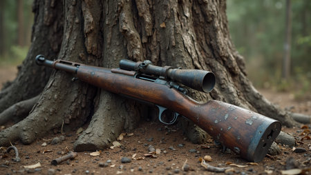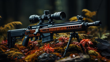 A detailed view of a precision rifle equipped with a scope, carefully placed amidst lush greenery in a tranquil forest.
