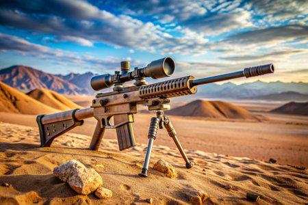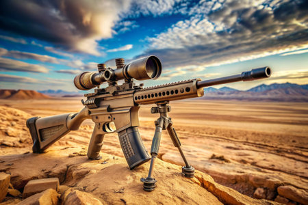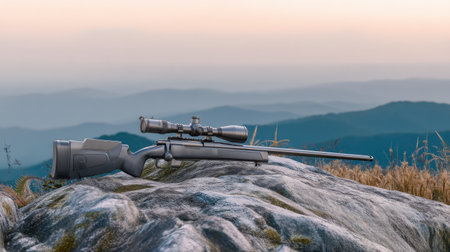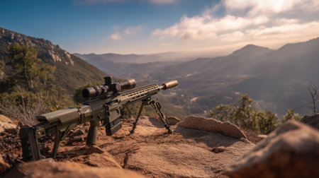 A sleek high precision rifle mounted with a scope rests on a rocky terrain in a natural setting.