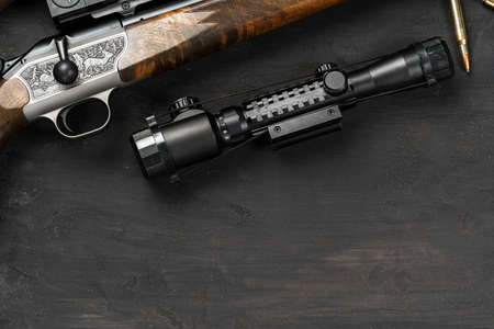 Opened hunting rifle with cartridges on a camouflage background with copy space for text. Selective focus.