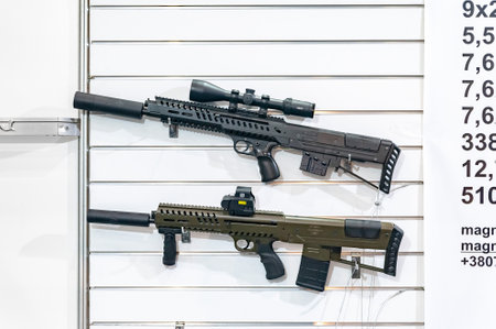 Automatic rifles. Stand with Ukrainian-made automatic rifles at the international exhibition ARMS AND SECURITY - 2021. Selective focus. Kiev. Ukraine - June 18, 2021.