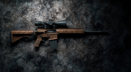 Photo of a camouflaged military AR-15 rifle with scope laying with knife, gun and tactical gloves side view.