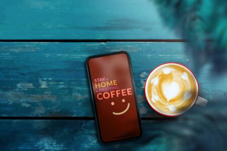 Covid-19 or Corona Virus Situation Concept. Message “Stay at Home and Enjoying Coffee†showing on Mobile Phone. Positive Mind. Top View