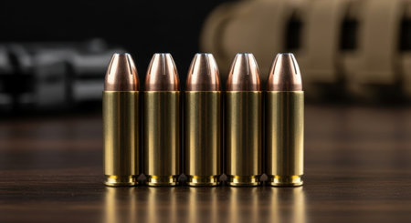 Five perfectly aligned 9mm ammunition rounds with gleaming brass casings and copper tips are displayed on a polished dark wood surface, with blurred firearms in the background.