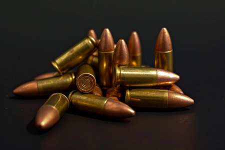 Group of metallic rifle bullets arranged on a dark surface with selective focus