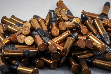 Numerous silver tipped bullets with brass casings randomly scattered across a smooth, light grey surface. concepts, conflict, war, danger, crime, violence, military, security, power.