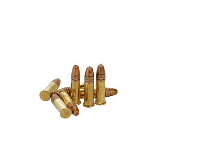 Scattered bullets on a white background. Concept of ammunition, firearm safety, military gear, crime investigation.