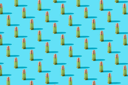 9mm gold Bullets amunition in a row, pattern on blue pastel backgraund