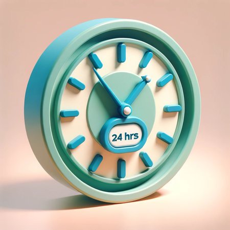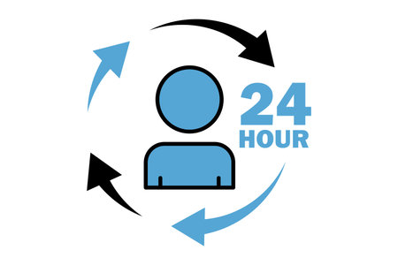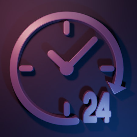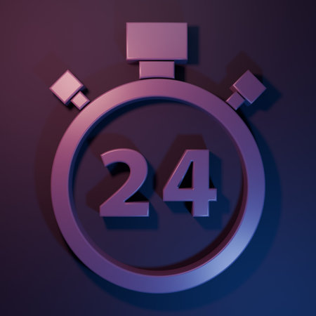 Person presenting a glowing 24 hour icon in their palm, symbolizing nonstop customer service, digital support and global availability for business and online communication