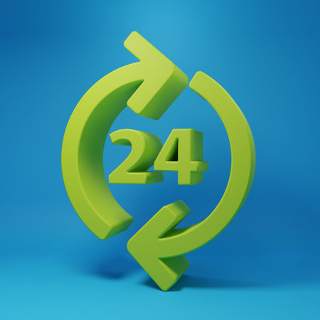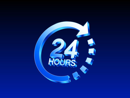 3D blue vector illustration of a 24 hours circular arrow icon representing nonstop service, support, or availability. 3d vector illustration. Vector illustration
