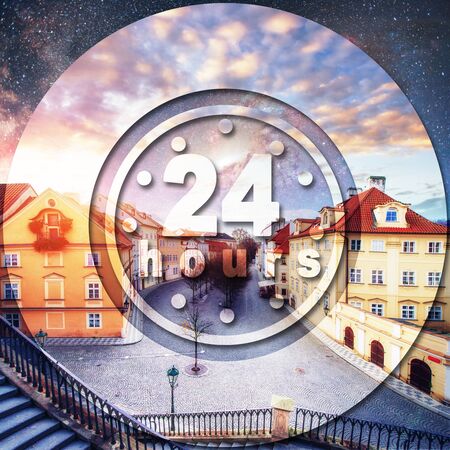 Open around the clock hours a day icon. Badge-clock work time.
