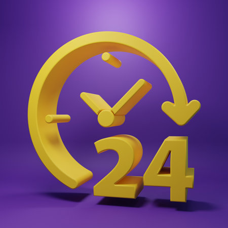 Yellow Clock 24 hours icon isolated on purple background. All day cyclic icon. 24 hours service symbol. Minimalism concept. 3D render illustration.