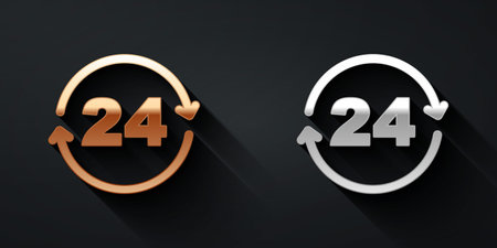 Gold and silver Telephone 24 hours support icon isolated on black background. All-day customer support call-center. Full time call services. Long shadow style. Vector
