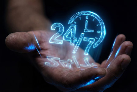 Male hand displaying a glowing blue neon 24 7 symbol with a clock interface in the palm to represent continuous customer service support and availability all day and night.