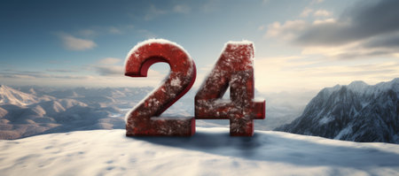 Happy new year 2024. Colorful abstract background. 3d rendering of a snow covered number 24 against a cloudy sky background