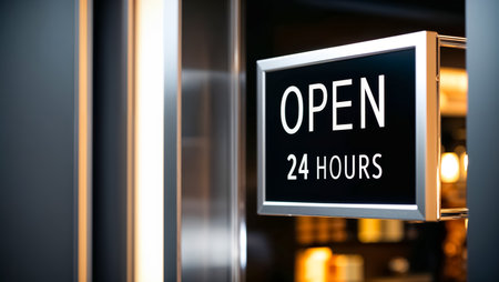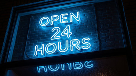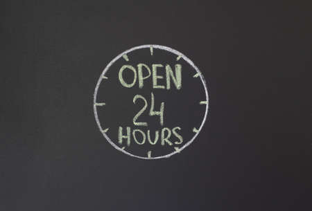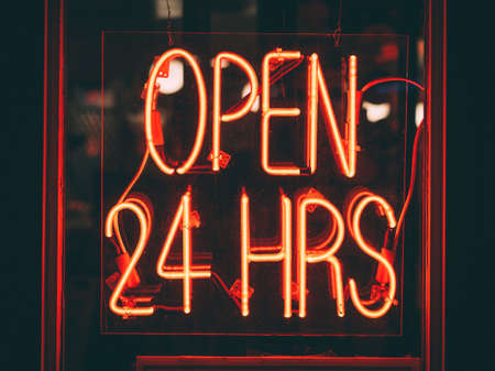24 Hours Always Open Sign in front of the regular coffee cafe or co-working space in the city new trend of working space