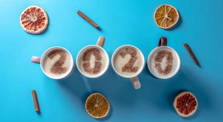 Card with numbers 2020 for New year and Christmas. Cup of coffee with figures on milk foam on blue background. The view from the top. Flat lay
