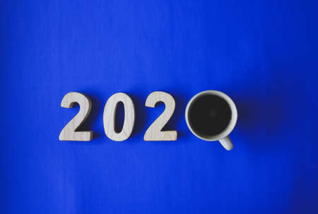 Concept celebrate New year 2020, number 2020 of wooden and cup of coffee on a blue paper background. Top view