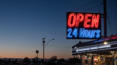 Vibrant neon sign Open 24 Hours above a diner in twilight red and blue glow against chrome faade