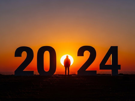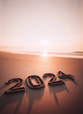 Happy New Year 2024, picture of 2024 numbers on the beach in the morning light generative ai