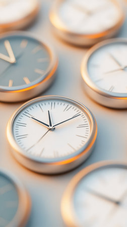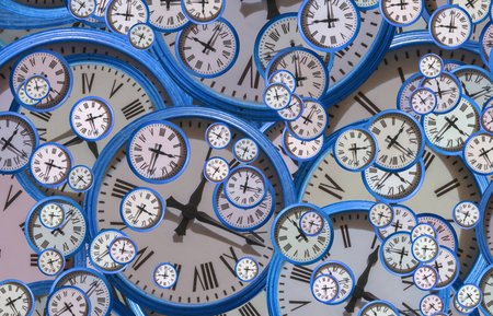 Many clocks are showing different times, creating a visual representation of stress, deadlines, and the challenges of time management in a busy schedule