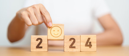 Smile face with 2024 block. Satisfaction, feedback, Review, mental health, eco sustainable and Happy New Year concept