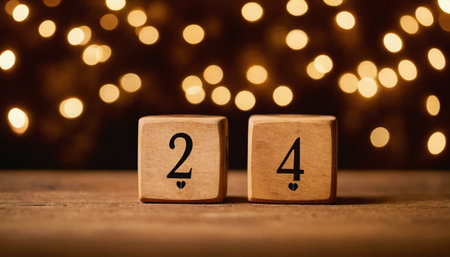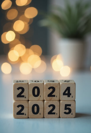 A charming arrangement of wooden blocks displays the years 2024 and 2025, set against a backdrop of soft, glowing bokeh lights that evoke a sense of warmth and anticipation. The gentle focus on the blocks, combined with the vibrant, twinkling lights, creates a festive atmosphere, perfect for celebrating new beginnings and the promise of the future.