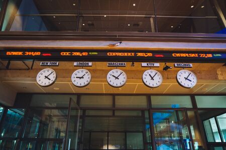 Poland, Warsaw, August 17, 2018. Clocks display time from various time zones at Warsaw Stock Exchange WSE, GPW) in Warsaw, Poland