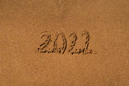 2022 is drawing on sand on a beach with a wave by the sea. Vacation on the sea. New Year concept