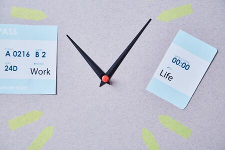 Work life balance choice concept. Clock arrows between parts of boarding pass with inscriptions