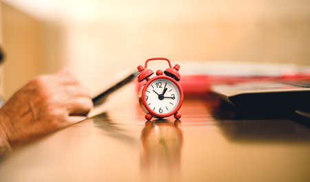 Time to call. Yellow handset and alarm clock on a red background. Copy space.