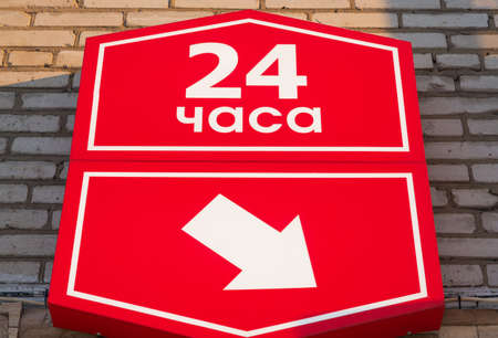 Red signboard with an arrow on a brick wall. Inscription in Russian 24 hours.