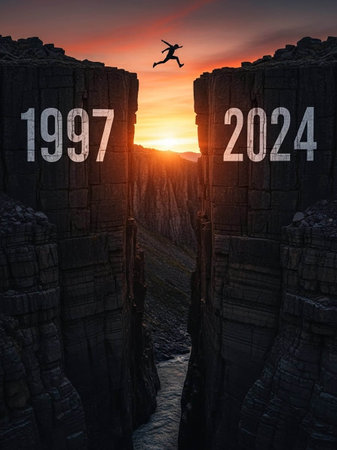 Happy new year concept. Silhouette of a man jumping from the cliff to the sunset.