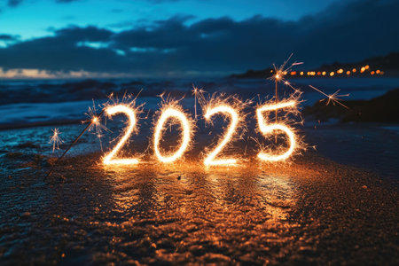 New Year celebration at beach with sparklers, illuminated numbers glowing in the sand at twilight, waves softly crashing in the background, reflecting hopes and dreams
