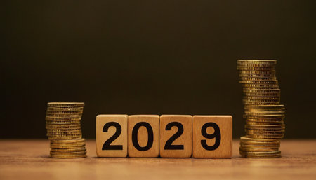 Four wooden blocks, each with a single digit carved into it, spell out the year 2029. These blocks are positioned centrally on a wooden table. Flanking the blocks are two substantial stacks of gold coins, one on the left and one on the right, creating a sense of balance and financial emphasis. The background is a dark, muted tone, allowing the golden coins and wooden blocks to stand out.