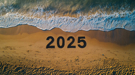 Aerial view of the year 2025 written in sand on a beach. Waves gently lap the shore, creating a tranquil atmosphere ideal for new year celebrations.