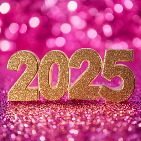 Golden numbers wishing a Happy New Year 2025 over festive background.