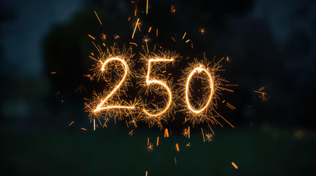 a sparkler forms the number two hundred and fifty against a dark and softly blurred background scene