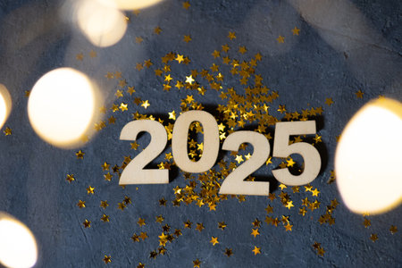 2025 new year wooden numbers with golden stars and bokeh