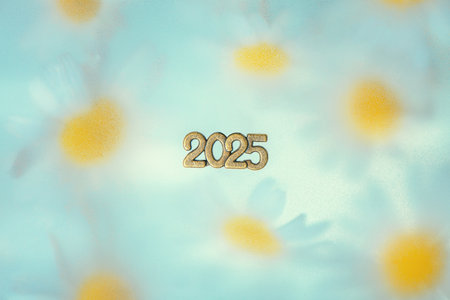 Number 2025 on a Floral Background with White Daisies, Concept 2025 year, Peace, Joy, Nature, care for nature and ecology