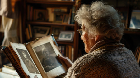 Elderly woman reflecting on vintage photos a symbol of nostalgia and the struggles of dementia