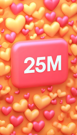 25 Million Celebration Banner on Vibrant Pink and Orange Hearts Background, Social Media Milestone