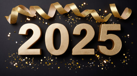 Bright gold numbers signify the arrival of 2025, surrounded by festive decorations, sparkling confetti, and shimmering ribbon, creating a joyful celebration atmosphere.