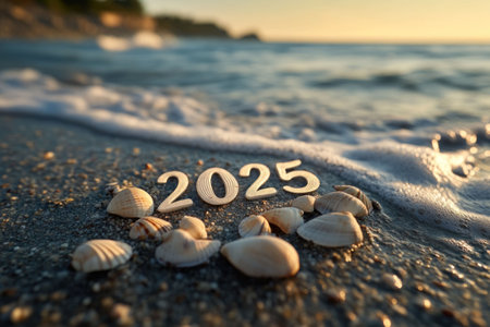 A peaceful beach scene featuring the numbers 2025 written in sand, framed by gentle waves. Perfect for New Year celebrations and beach-themed designs.