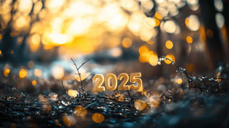 The year 2025 is displayed with golden lights amidst a softly glowing background of blurred trees and sunset colors.