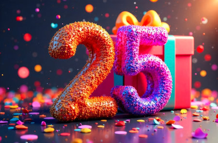 A vibrant display of the year 2025 adorned with shimmering sparkles and colorful lights creating a festive atmosphere for the new year.