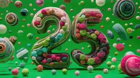 Vibrant artwork featuring the number 25 crafted with colorful textile patterns and floating decorative balls, perfect for celebrating milestones.
