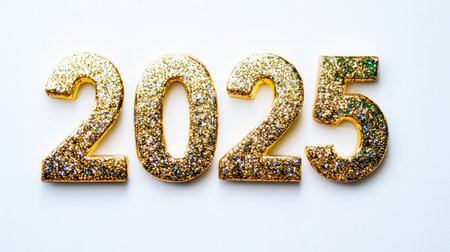 Golden glittery 2025 numbers isolated on a white background, perfect for Happy New Year celebrations and festive decorations.