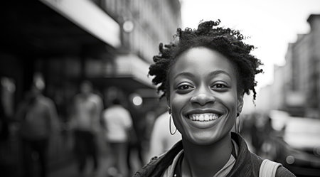 Portrait of a young African American man laughing against bokeh background. Noir et blanc
