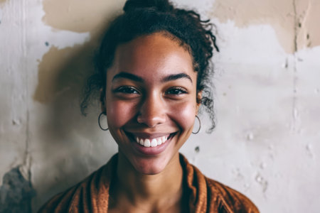 A young woman with dark hair and a warm smile is captured in an indoor environment. She wears a textured outfit and gold hoop earrings radiating confidence and joy while engaging with the camera.